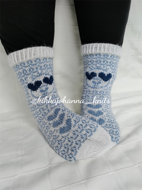 Tämä sukkamalli syntyikin piirustuspöydällä aika nopsaan, tulihan sukkien aihe suoraan mun sydämestä. Muuten sukkien ja ohjeen tekoon kuluikin kuukauden päivät, ennekuin mä saatoin sanoa, että nyt ne on valmiit. Mulla on sellanen tapa suunnitella sukkia, että tuo malli muuttuu ja kehittyy lopulliseen muotoonsa siihen asti, kunnes viimeinenkin silmukka on neulottu.